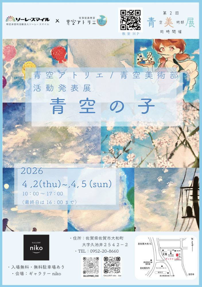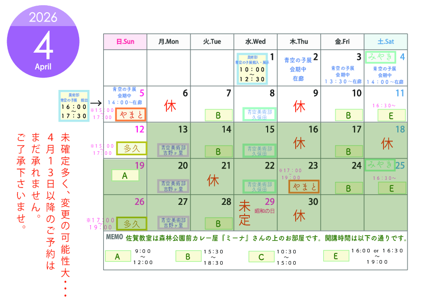 | 開講日 場所 | 三養基教室 市村清記念メディカルコミュニティセンター 多目的スペース(2) 主に土曜日 月2回程度 吉野ヶ里教室 吉野ヶ里中央公民館 毎週月曜日(月3回程度) 佐賀教室 森林公園前 毎週火曜、 毎週金曜、 隔週土曜 隔週日曜、 祝日 大和教室 ギャラリーniko 隔週日曜 多久教室 あいぱれっと会議室A 隔週日曜 ※都度変更あり ※長期休暇中は異なります。 詳細はTOPページ『お知らせ』より 開講日のカレンダーをご覧ください。 |