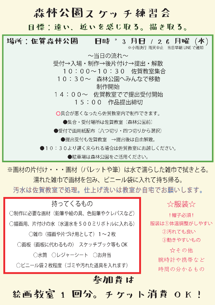 | 4回チケット 1ヶ月有効 | おとな ¥7500 美術部おとな ¥4000 中2〜高生 ¥7000 美術部中2〜高校生 ¥3500 小4〜中1 ¥6000 美術部小4〜中1 ¥3000 年中〜小3 ¥5000 全ての開講場所、開講日、開講時間をご利用いただけます。 お支払い日から1ヶ月間有効。 1回あたり概ね2時間程度とします。 |